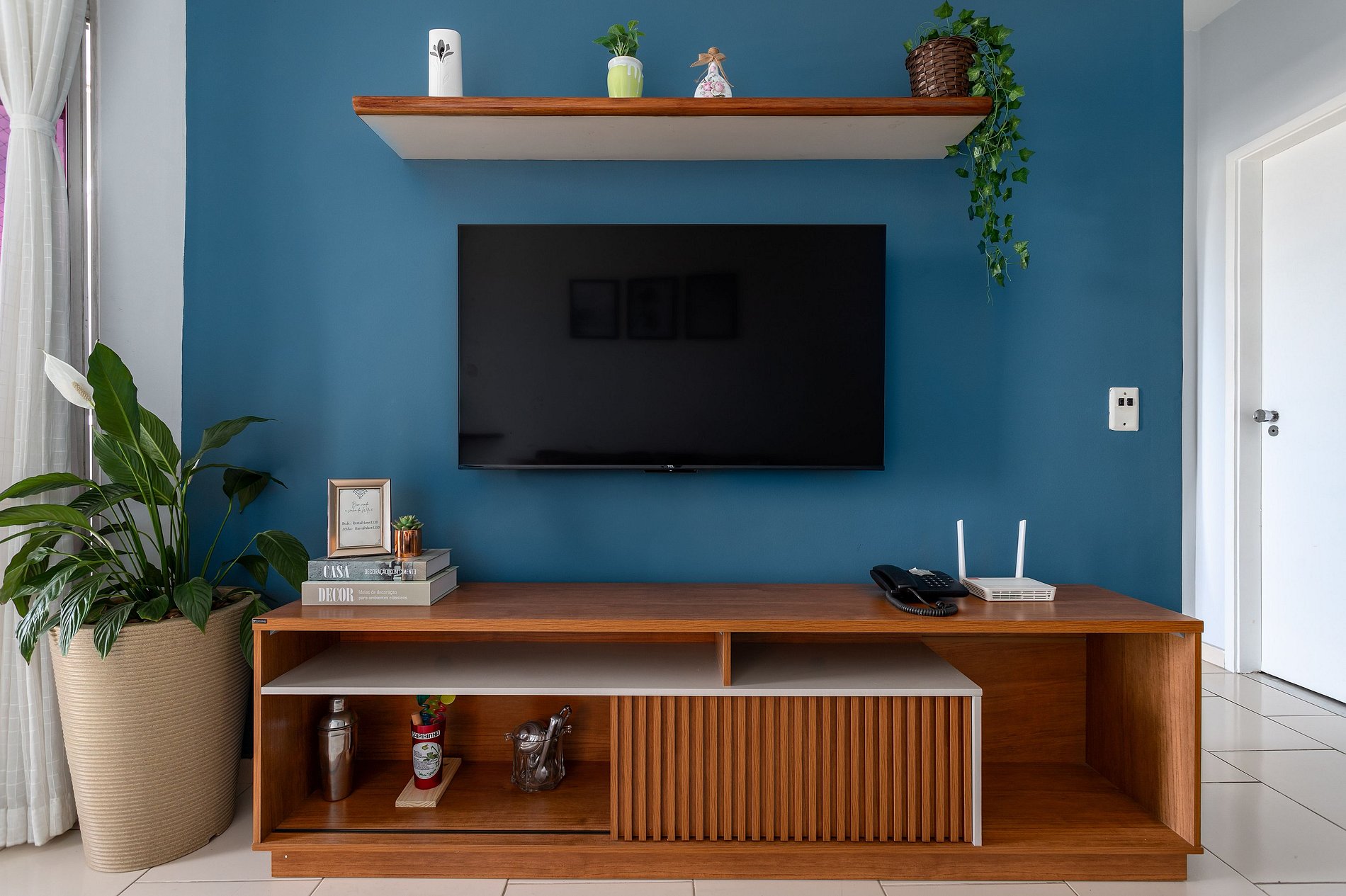 A senha do Wi-Fi está em um pequeno quadro sobre o móvel da tv da sala.
