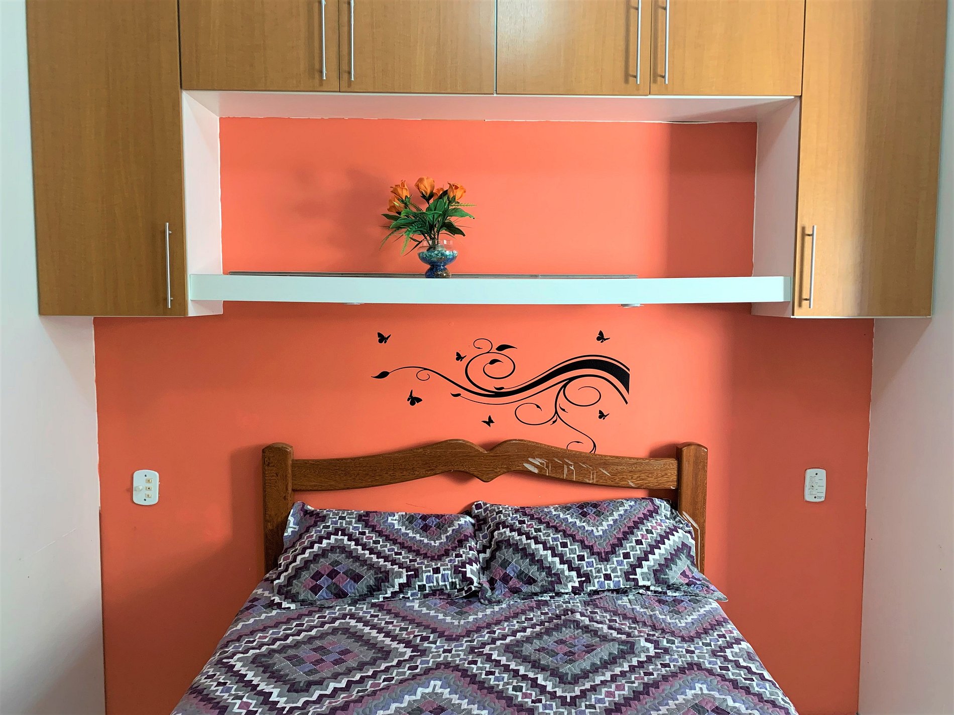 Quarto - Uma Cama de casal, armários e ar condicionado.