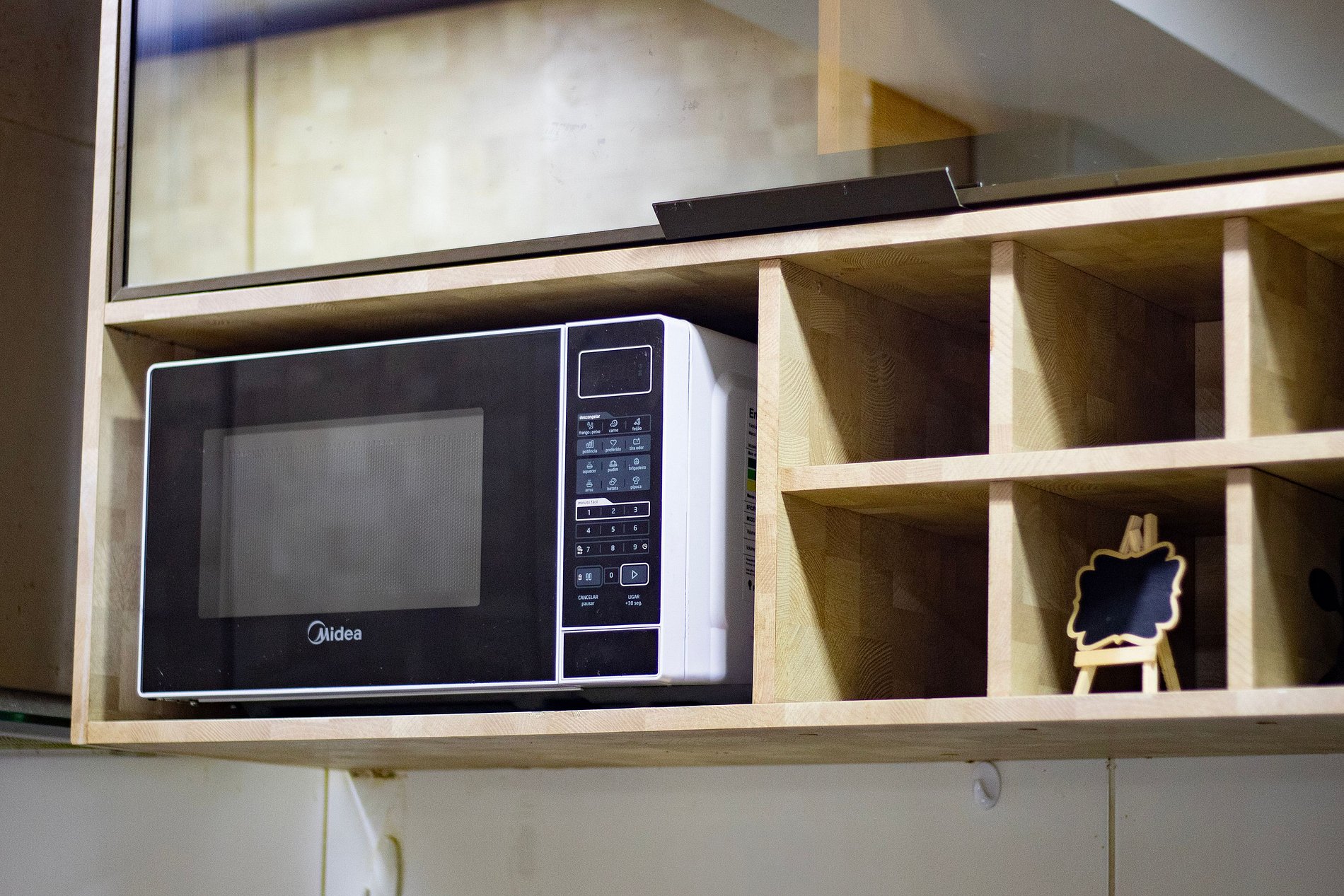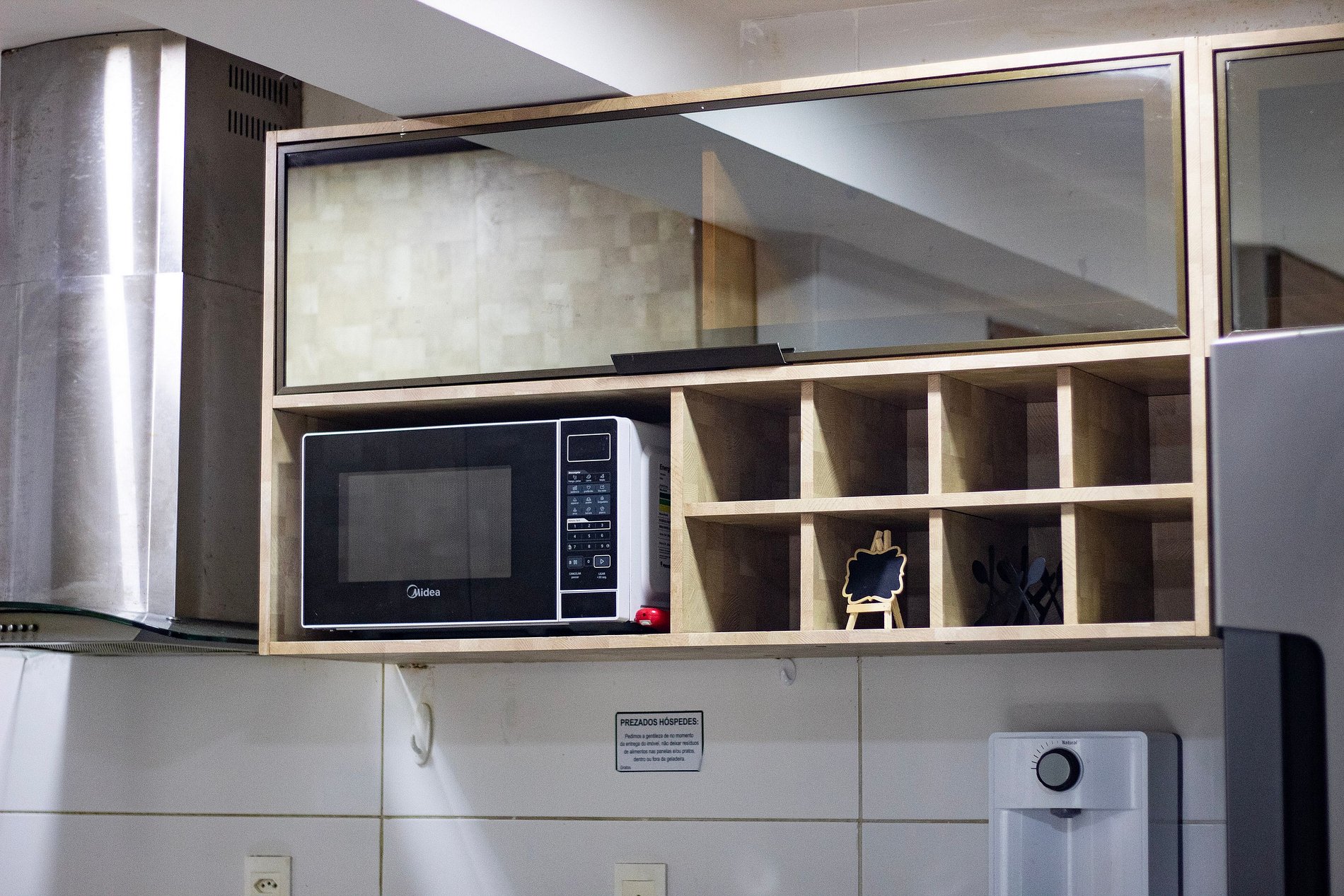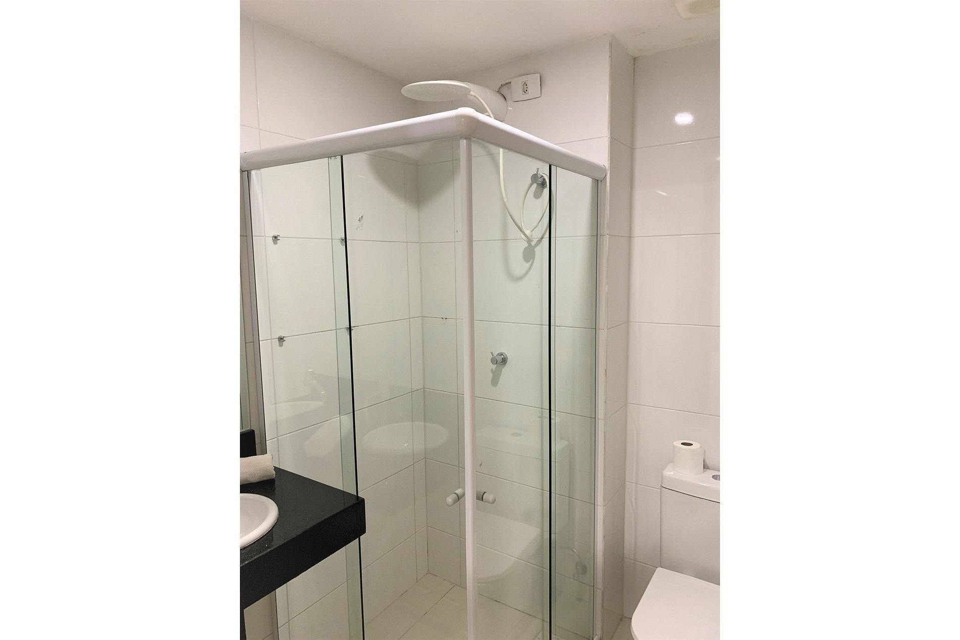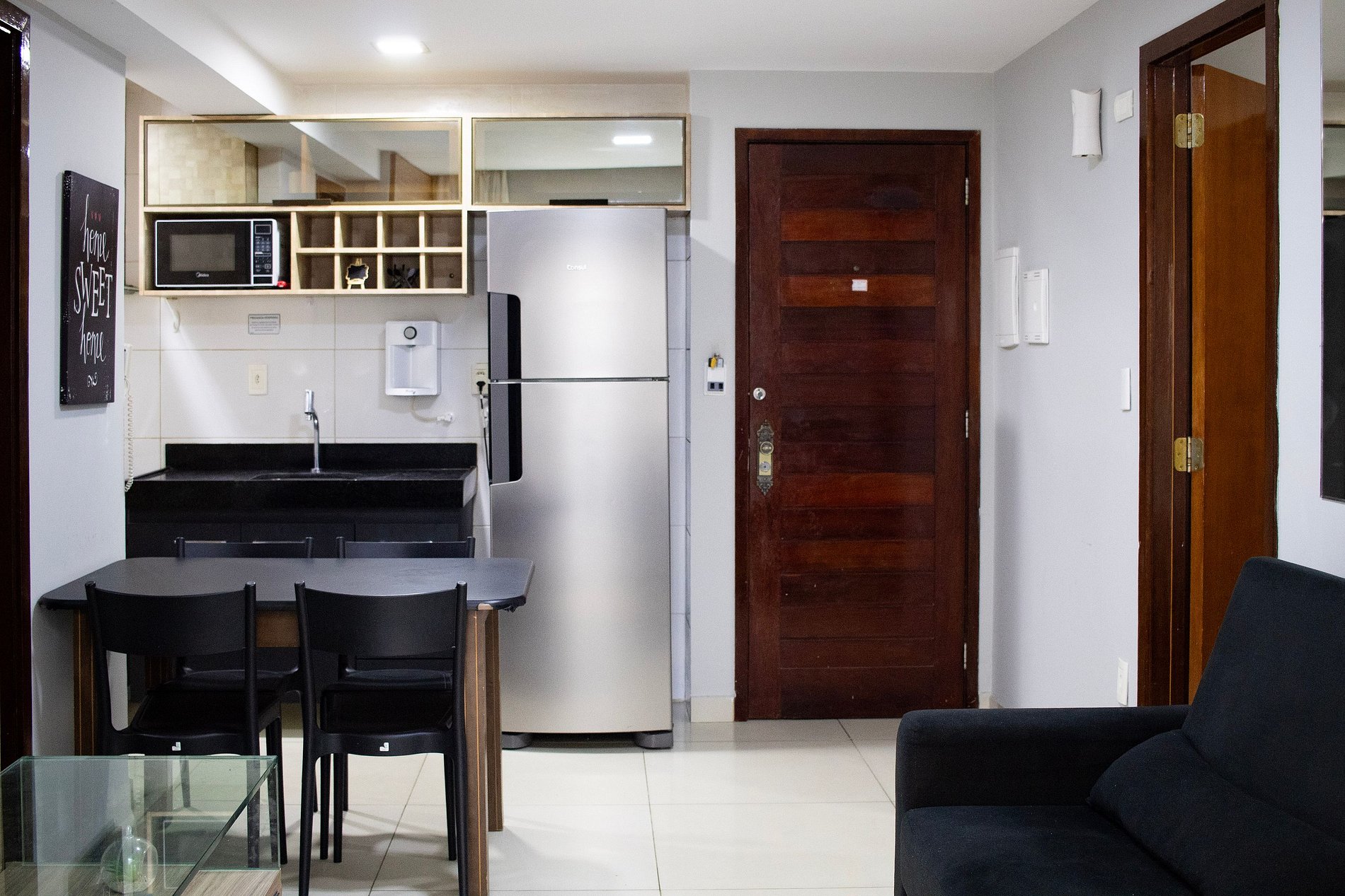 A cozinha é moderna e compacta, com fogão de 4 bocas, micro-ondas, geladeira e utensílios necessários para refeições práticas. O banheiro possui ducha higiênica, blindex e água quente.