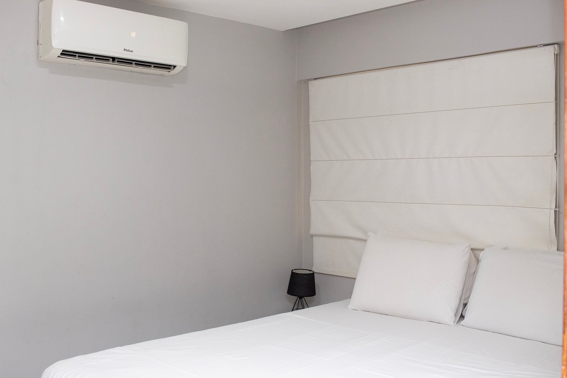 Suíte 1: cama Queen Size, ar-condicionado e armário.