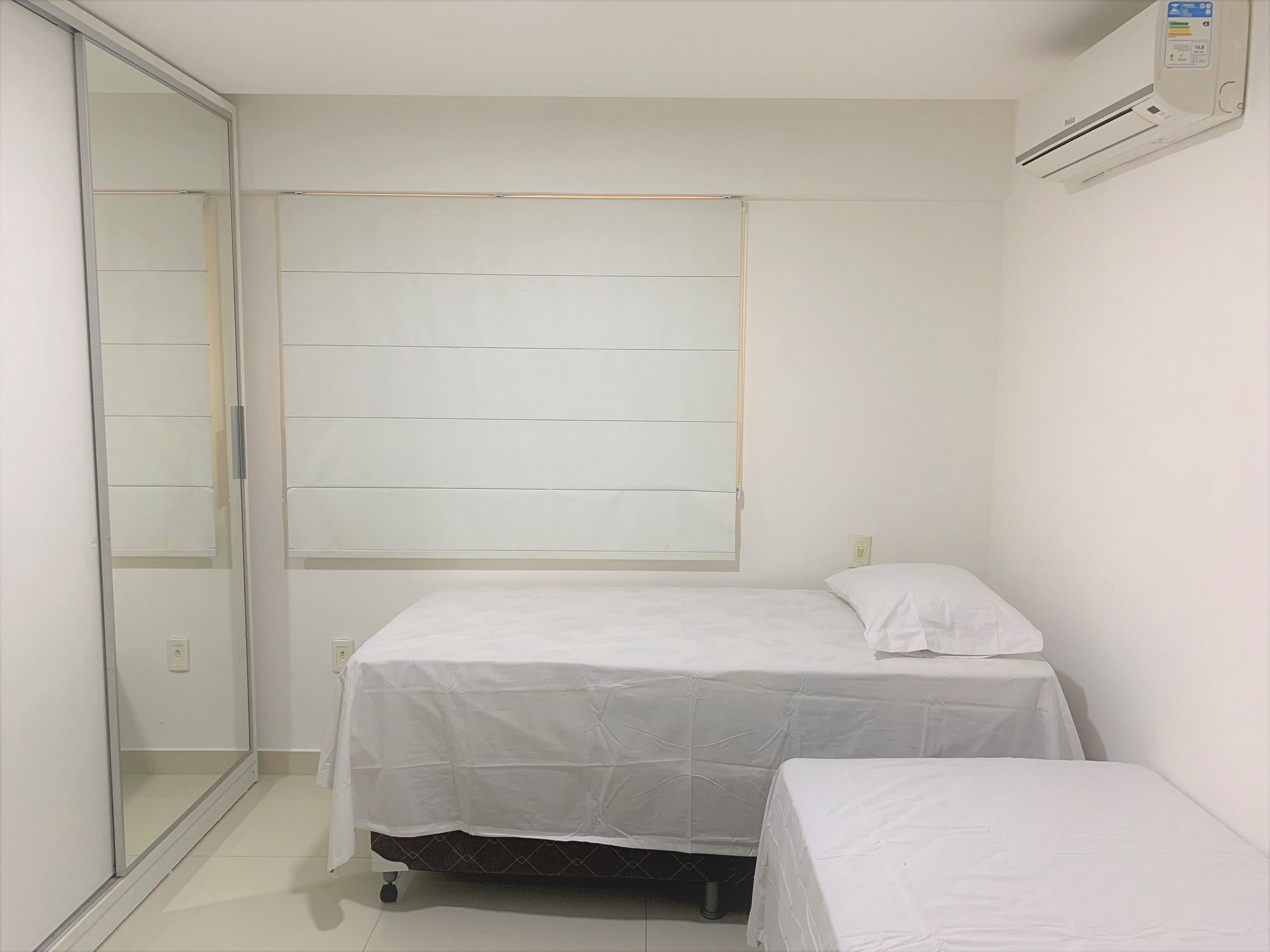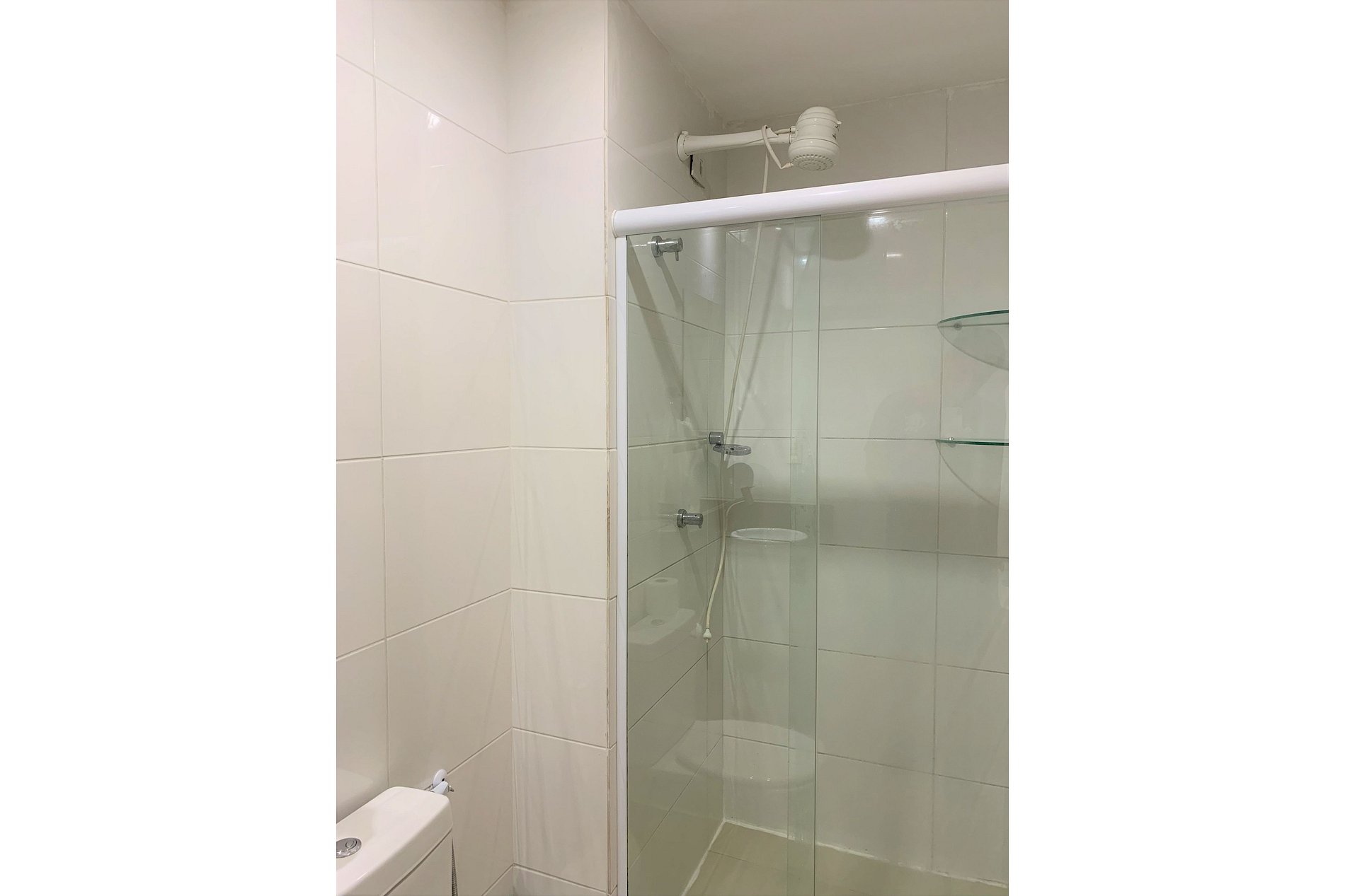 Cozinha moderna e compacta com fogão de 4 bocas, microondas, geladeira e utensílios de cozinha. Banheiro cômodo com ducha higiênica, blindex e água quente. Esse apartamento é ideal para sua estadia em João Pessoa, contando com internet Wi-Fi.