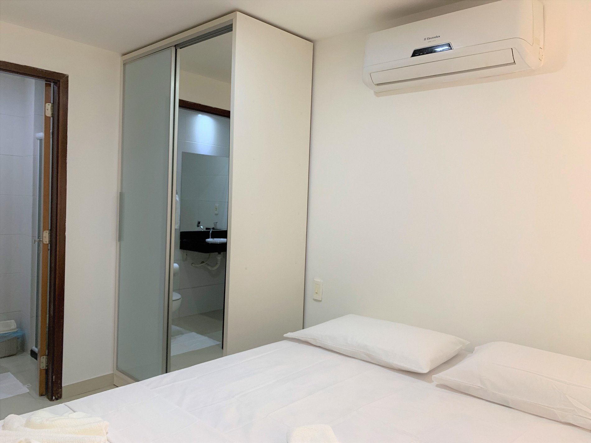 Suíte 1 confortável com cama Queen Size, ar condicionado e armário.