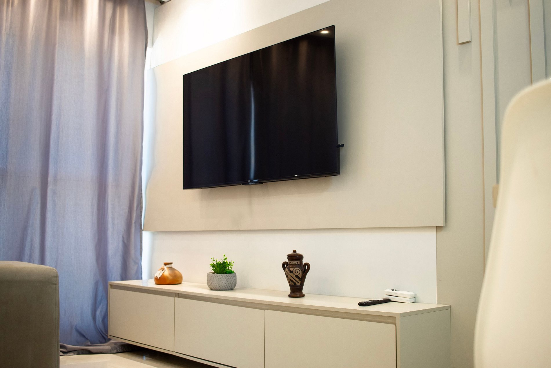 A sala desse apartamento possui TV LED, sofá cama e ventilador.