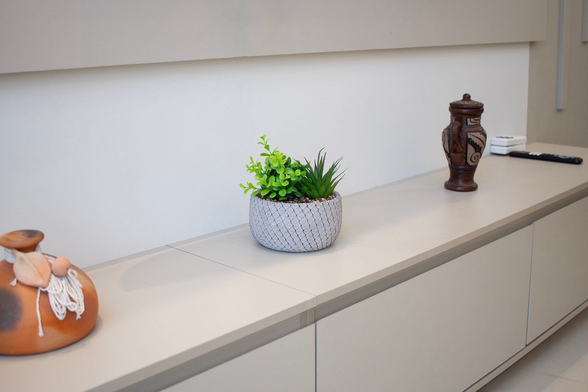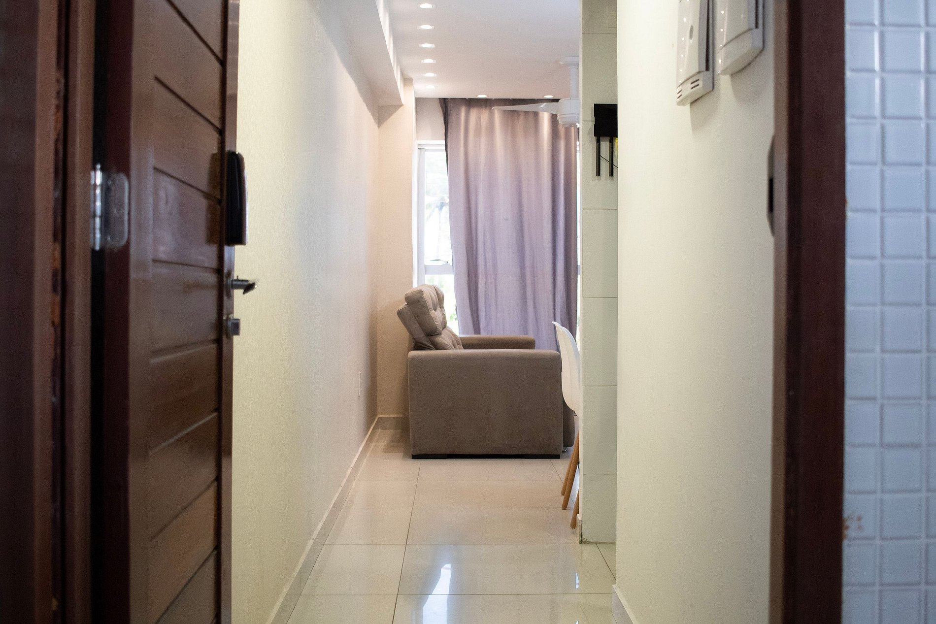 Cozinha moderna e compacta com fogão de 4 bocas, microondas, geladeira e utensílios de cozinha. Banheiro cômodo com ducha higiênica, blindex e água quente. Esse apartamento é ideal para sua estadia em João Pessoa, contando com internet Wi-Fi.