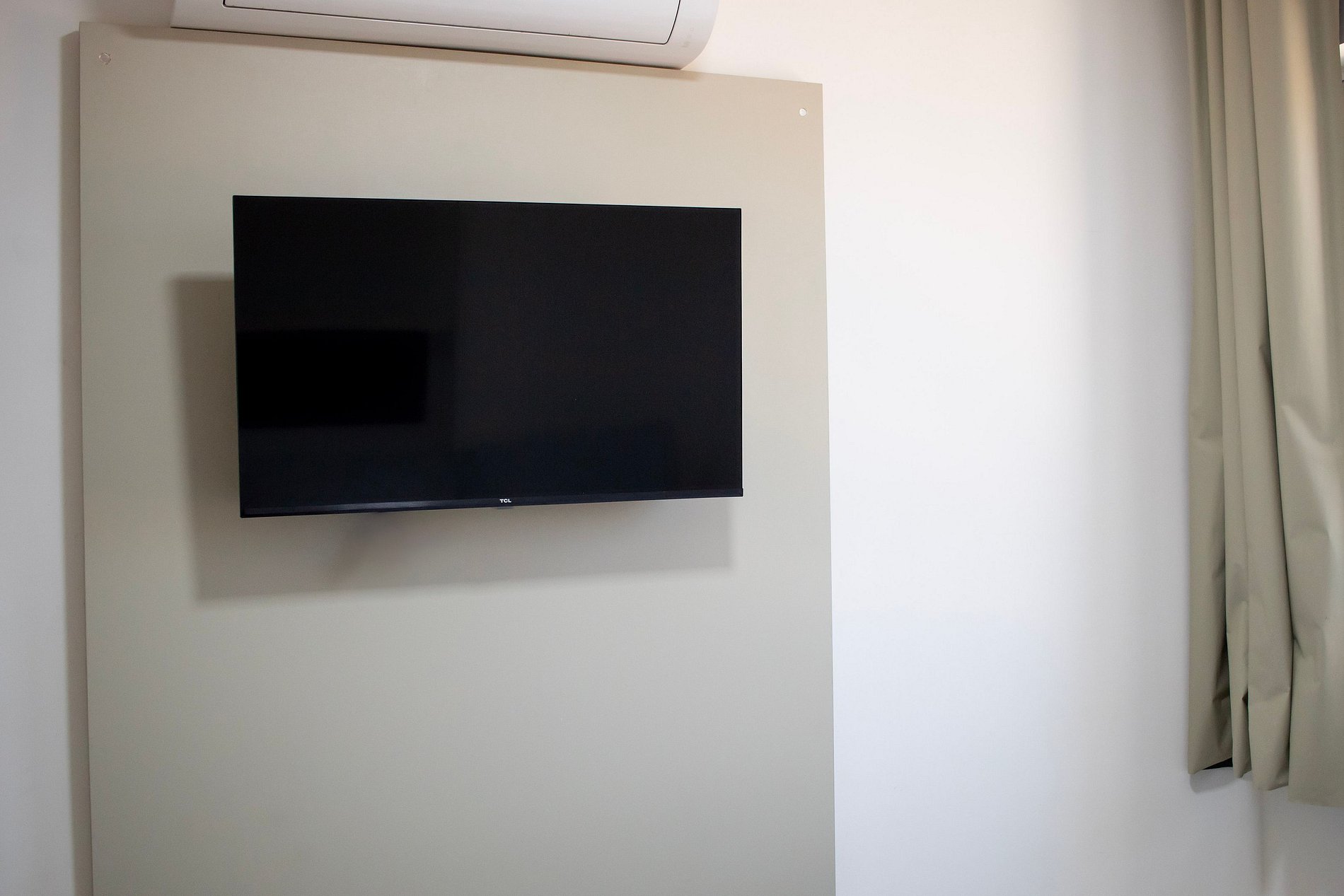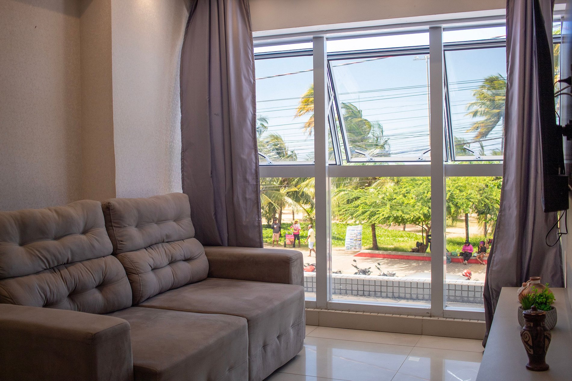 A sala desse apartamento possui TV LED, sofá cama e ventilador.
