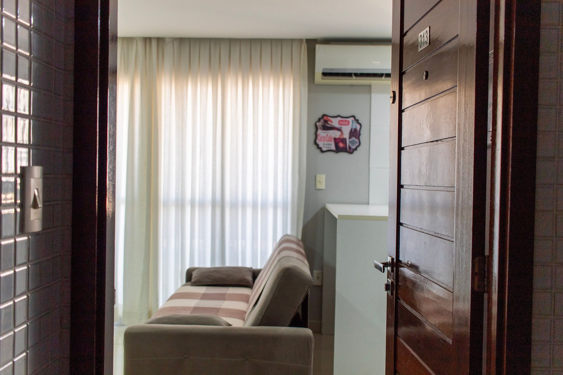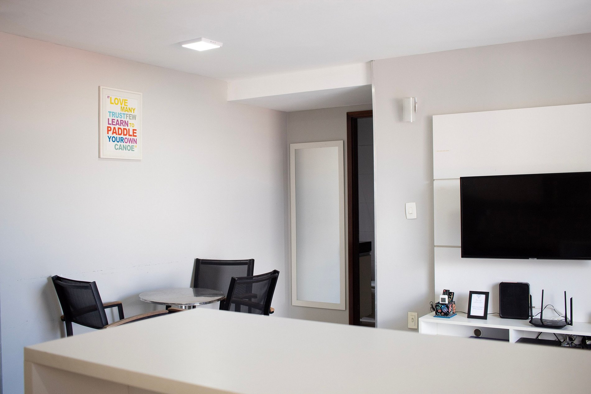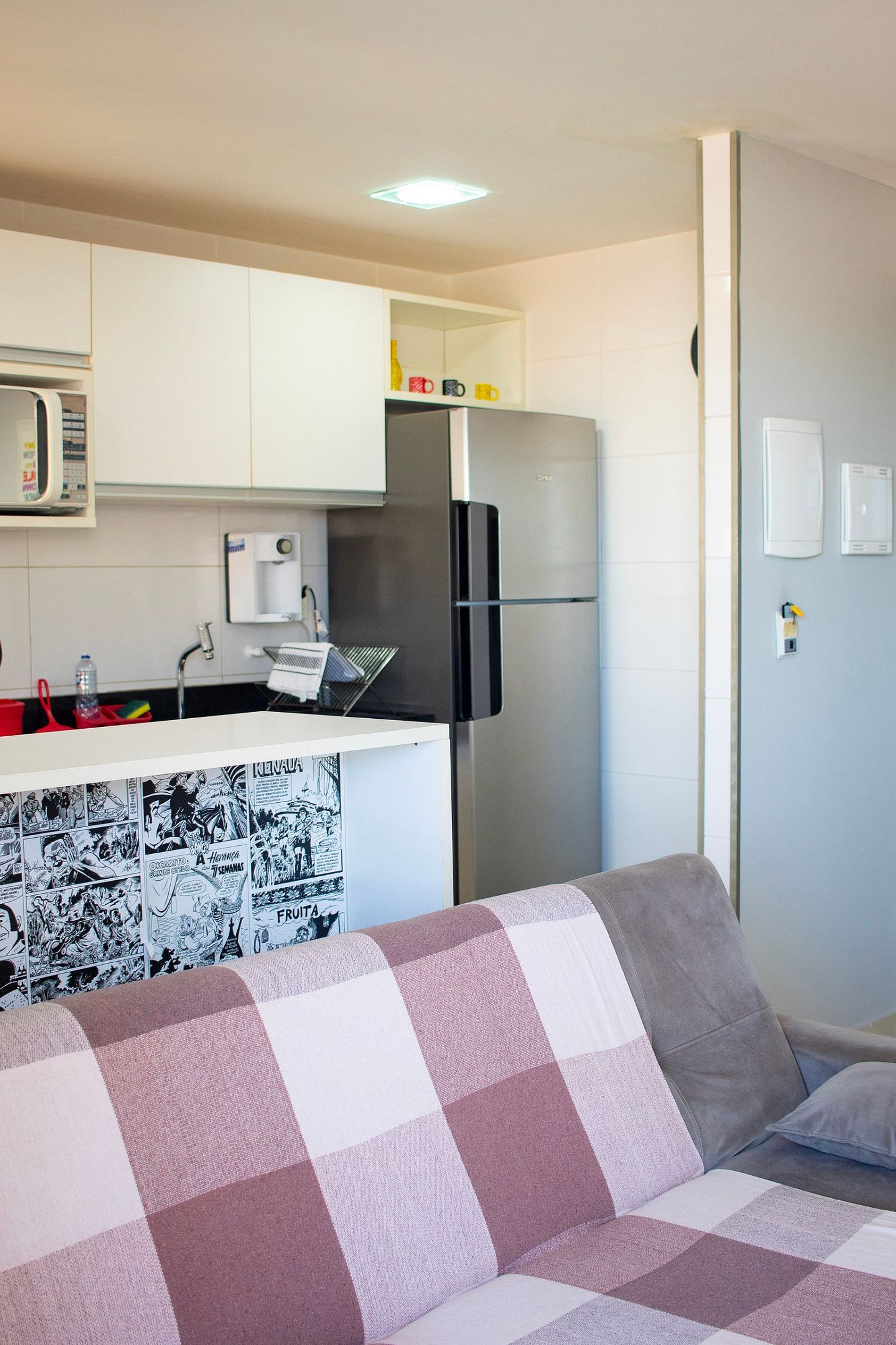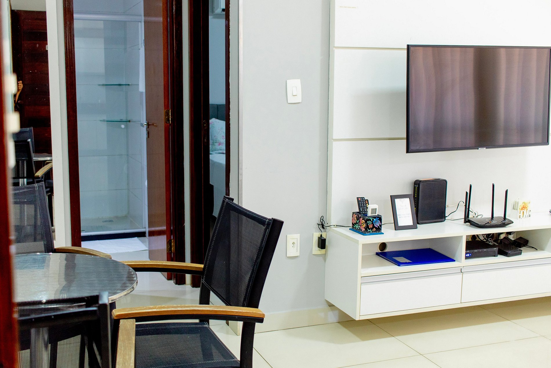 A sala desse apartamento possui SMART TV de LED com NETFLIX, sofá cama e ar condicionado. Quarto confortável com cama de casal, ar condicionado e armário. Cozinha moderna e compacta com fogão de 4 bocas, microondas, geladeira e utensílios de cozinha. Banheiro cômodo com ducha higiênica, blindex e água quente. Esse apartamento é ideal para sua estadia em João Pessoa, contando com internet e TV.