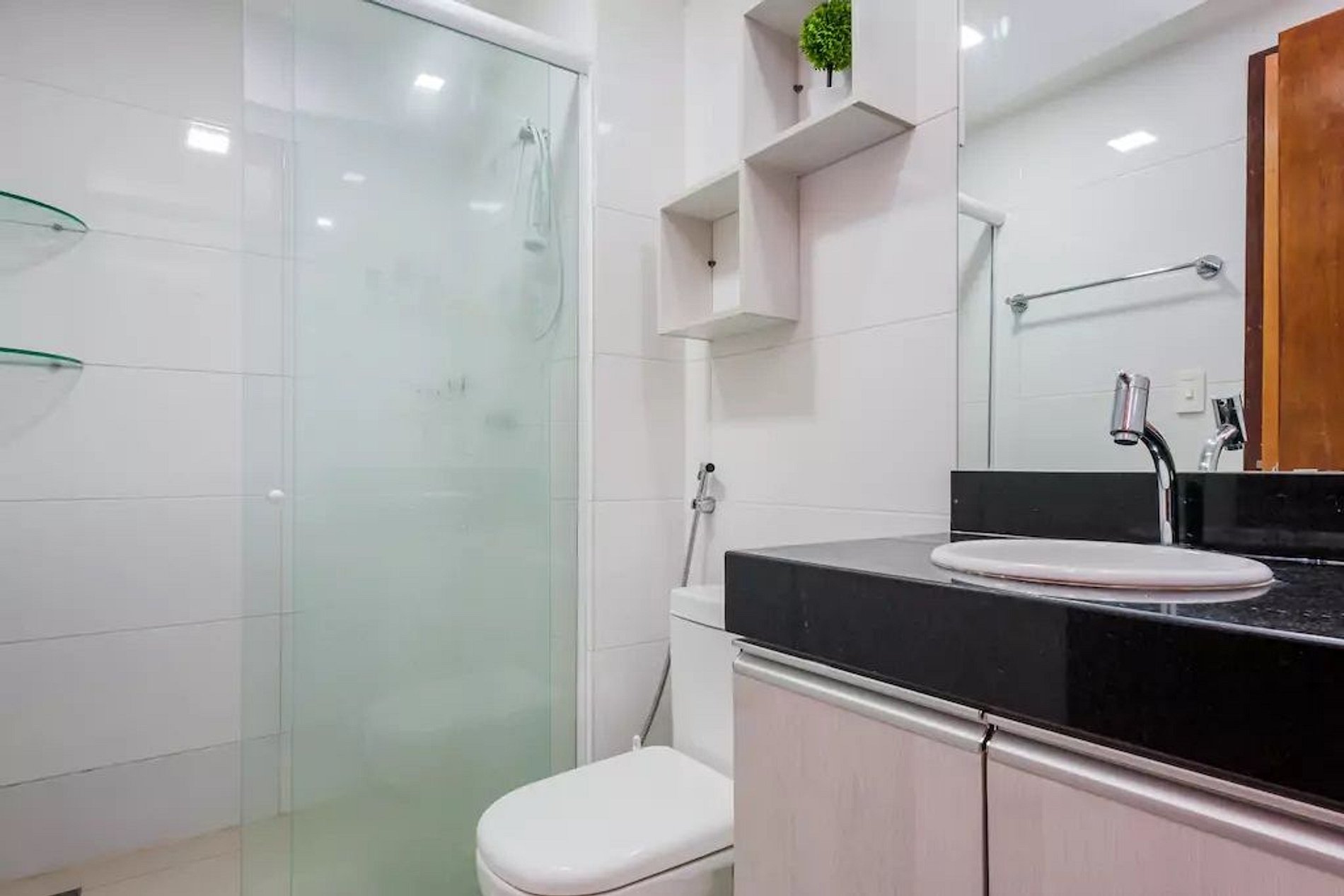 A sala desse apartamento possui TV LCD, sofá cama e ar condicionado. Quarto confortável com cama de casal, ar condicionado e armário. Cozinha moderna e compacta com fogão de 4 bocas, microondas, geladeira e utensílios de cozinha. Banheiro cômodo com ducha higiênica, blindex e água quente. Esse apartamento é ideal para sua estadia em João Pessoa, contando com internet e TV a cabo.