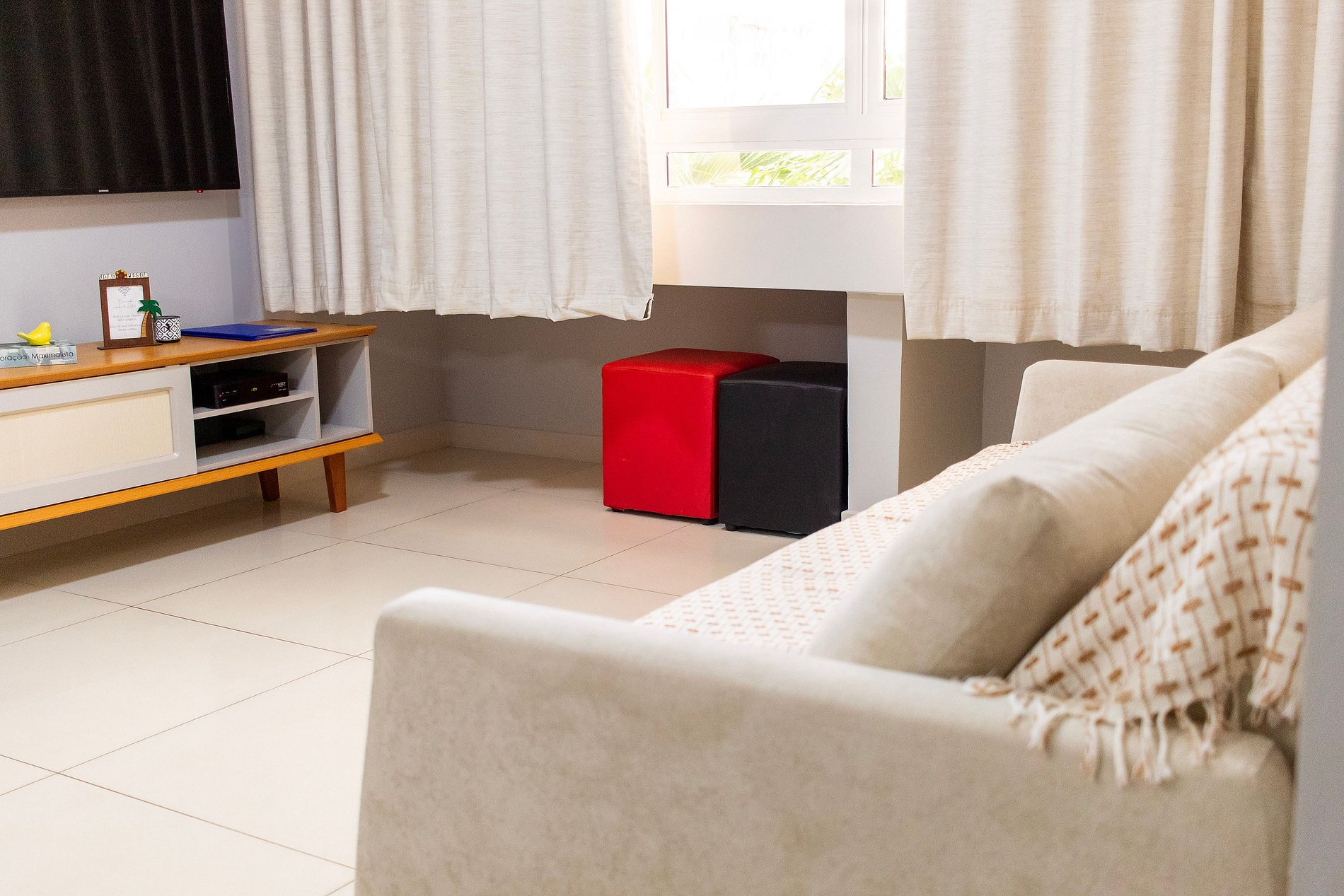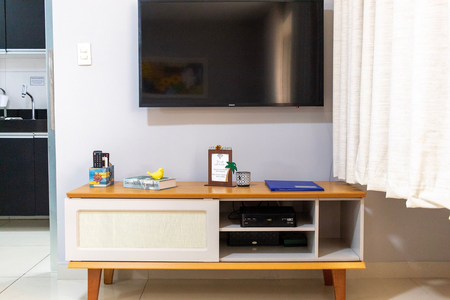 A sala possui TV LCD, sofá-cama e ar condicionado, ideal para relaxar ou trabalhar.