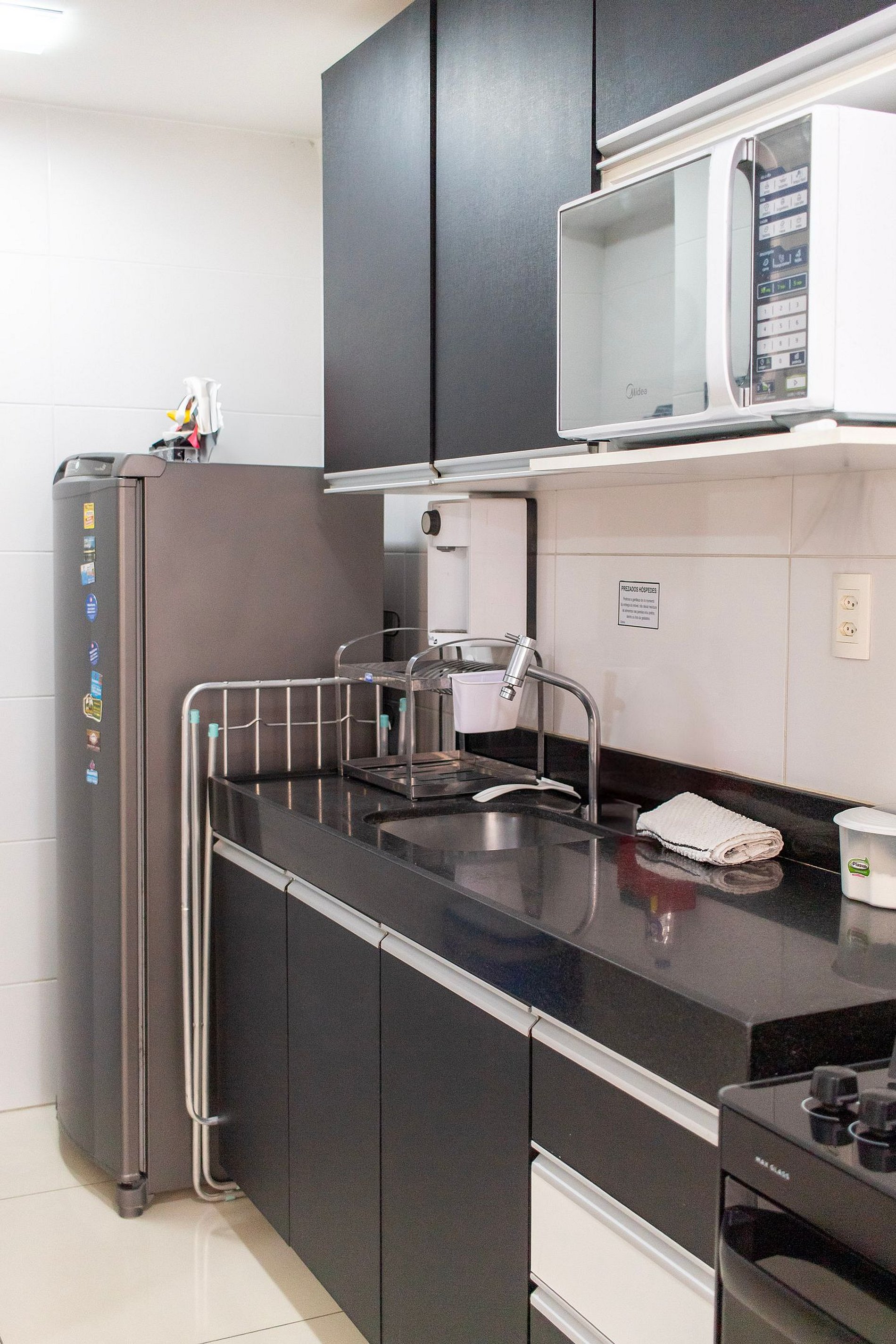 A cozinha é moderna e compacta, equipada com fogão, micro-ondas, geladeira e utensílios necessários para preparar refeições.