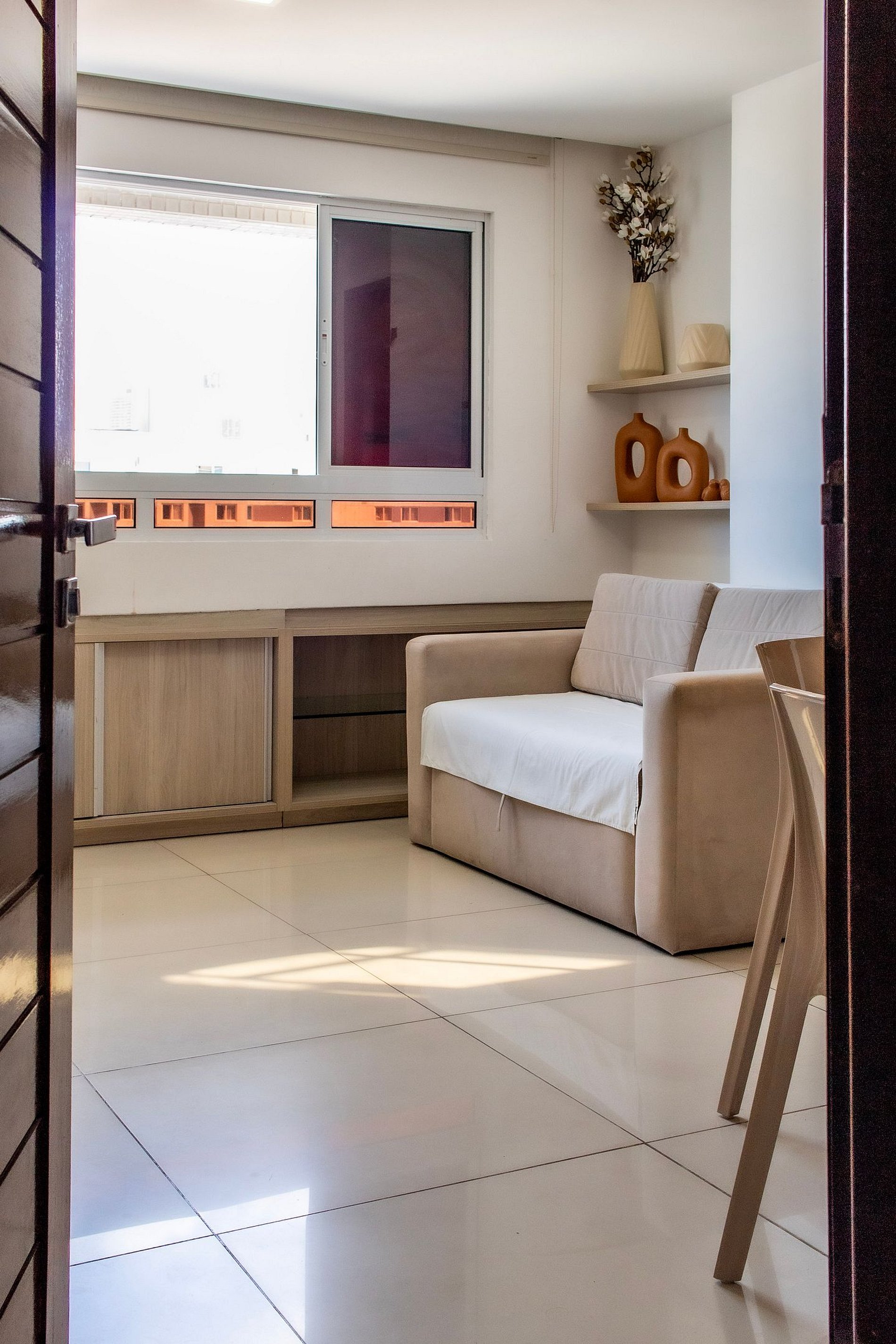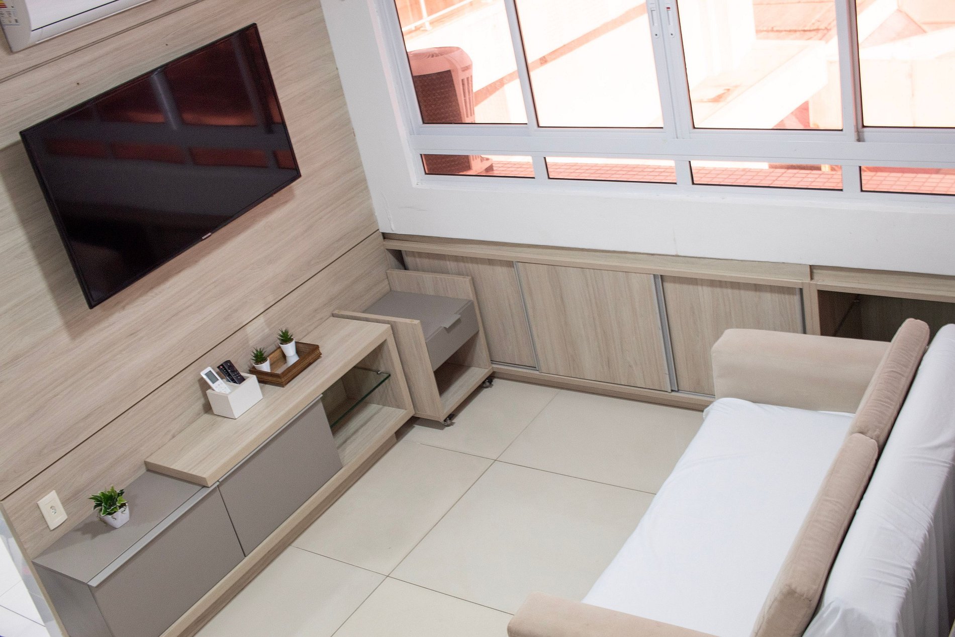 A sala desse apartamento possui TV LCD, sofá cama e ar condicionado. Quarto confortável com cama King, ar condicionado e armários. Cozinha moderna e compacta com fogão de 4 bocas, microondas, geladeira e utensílios de cozinha. Banheiro cômodo com ducha higiênica, blindex e água quente. Esse apartamento é ideal para sua estadia em João Pessoa, contando com internet e TV.
